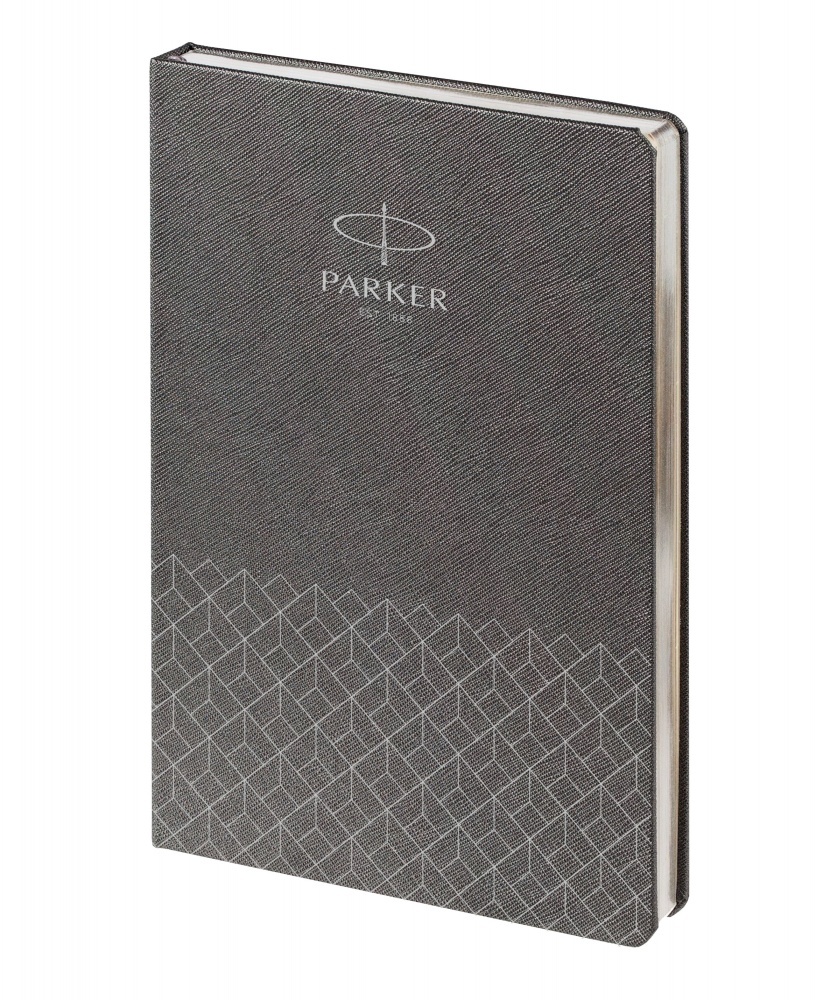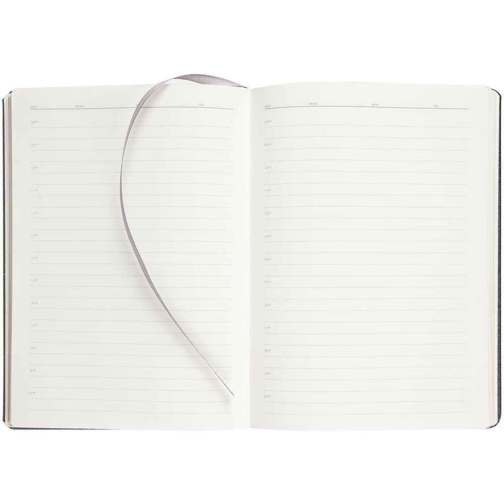 Ежедневник с твердой обложкой и серебристым обрезом, темно-серый, дополнен ляссе в цвет обложки.