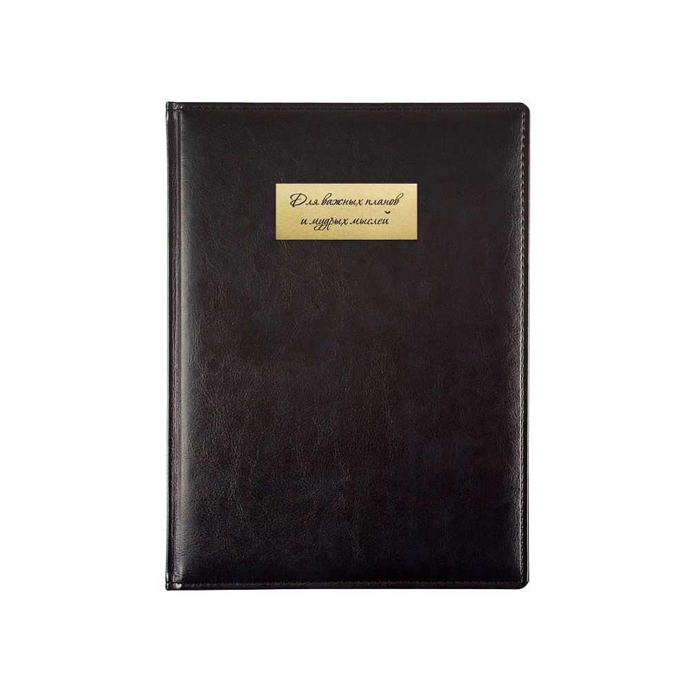 Мягкий и приятный на ощупь ежедневник с гравировкой "Для важных планов и мудрых мыслей" на латунной табличке золотого цвета.