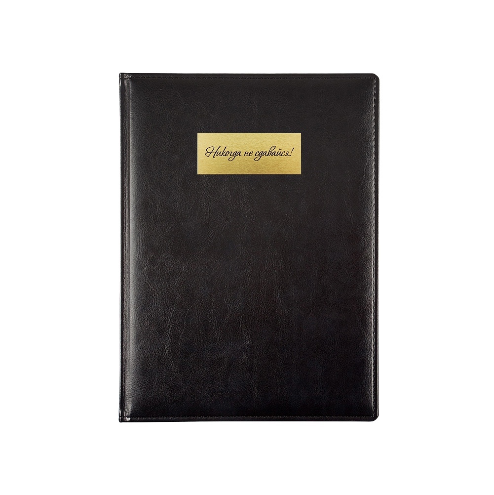 Мягкий и приятный на ощупь ежедневник с гравировкой "Никогда не сдавайся" на латунной табличке золотого цвета.