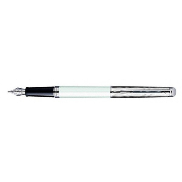 Тип ручки: Перьевая. Перо: нержавеющая сталь. Корпус: нержавеющая сталь, белый лак, гравированный волнообразный декор на колпачке, блестящее палладиевое покрытие колпачка