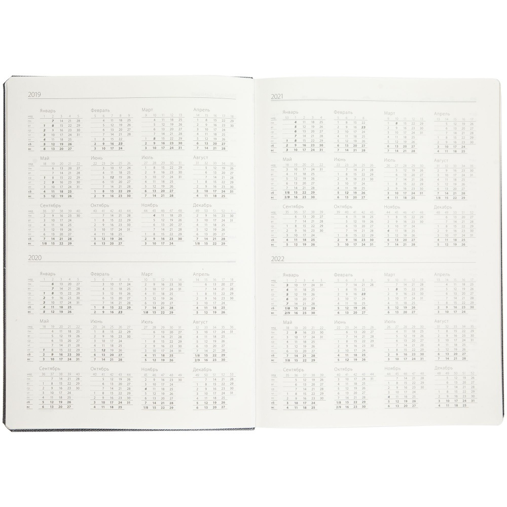 Ежедневник с твердой обложкой и серебристым обрезом, выполнен из материала Saffian, темно-серый, дополнен ляссе в цвет обложки.