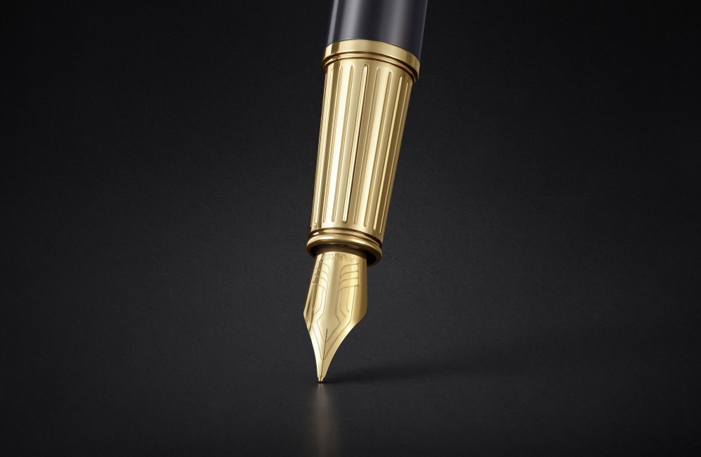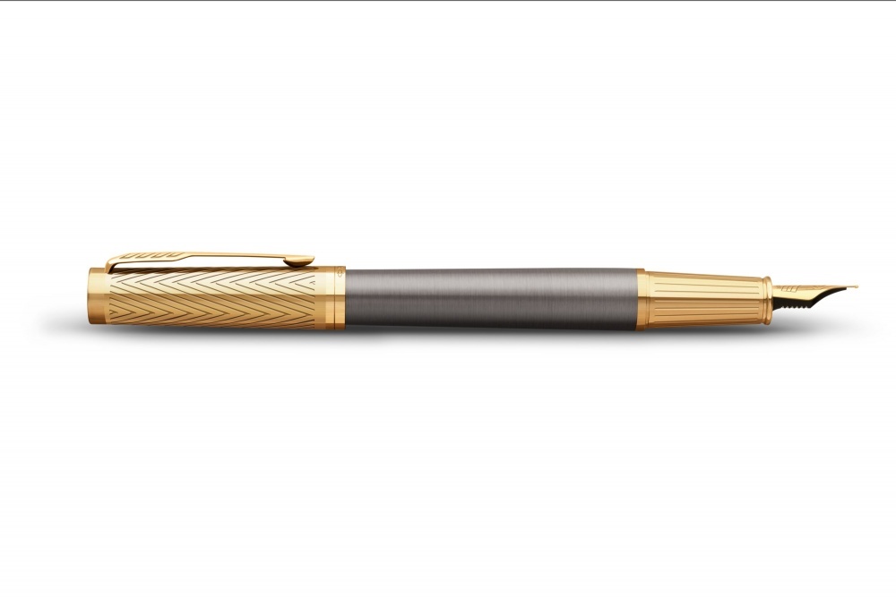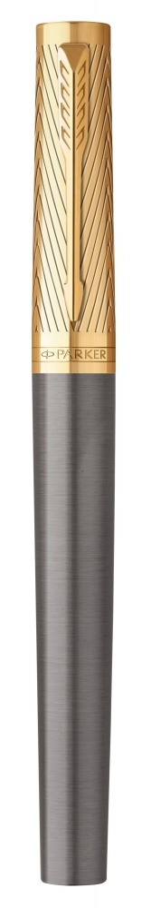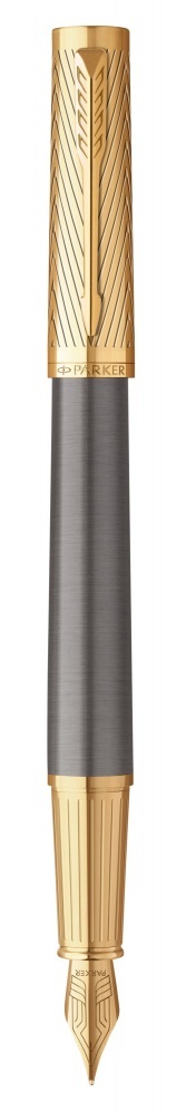 Перьевая ручка Parker из коллекции Ingenuity Arrow выполнена из латуни и покрыта серым лаком. Колпачок и зона захвата дополнены гравировкой, колпачок и декоративные элементы отделаны позолотой. Перо из нержавеющей стали с позолотой. Ручка упакована в специальную премиальную подарочную коробку Parker с откидной крышкой. В комплекте идет картридж черного цвета, он находится под платформой с ручкой.