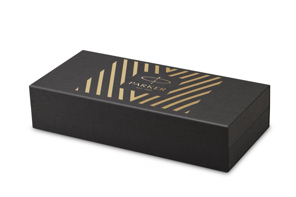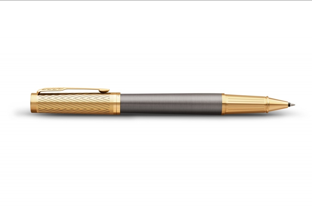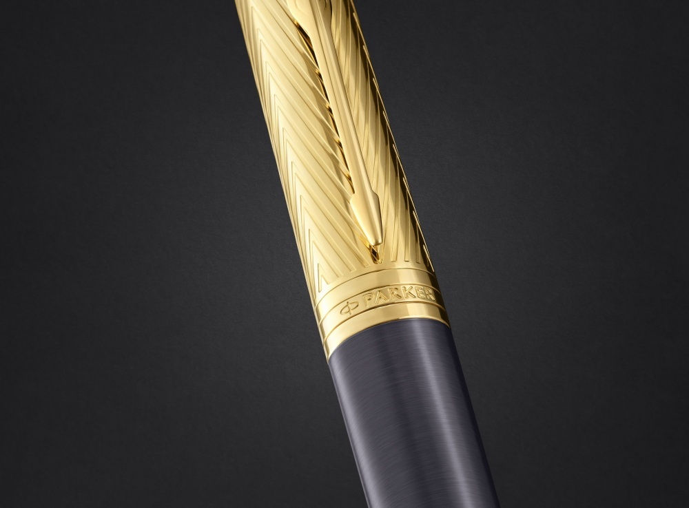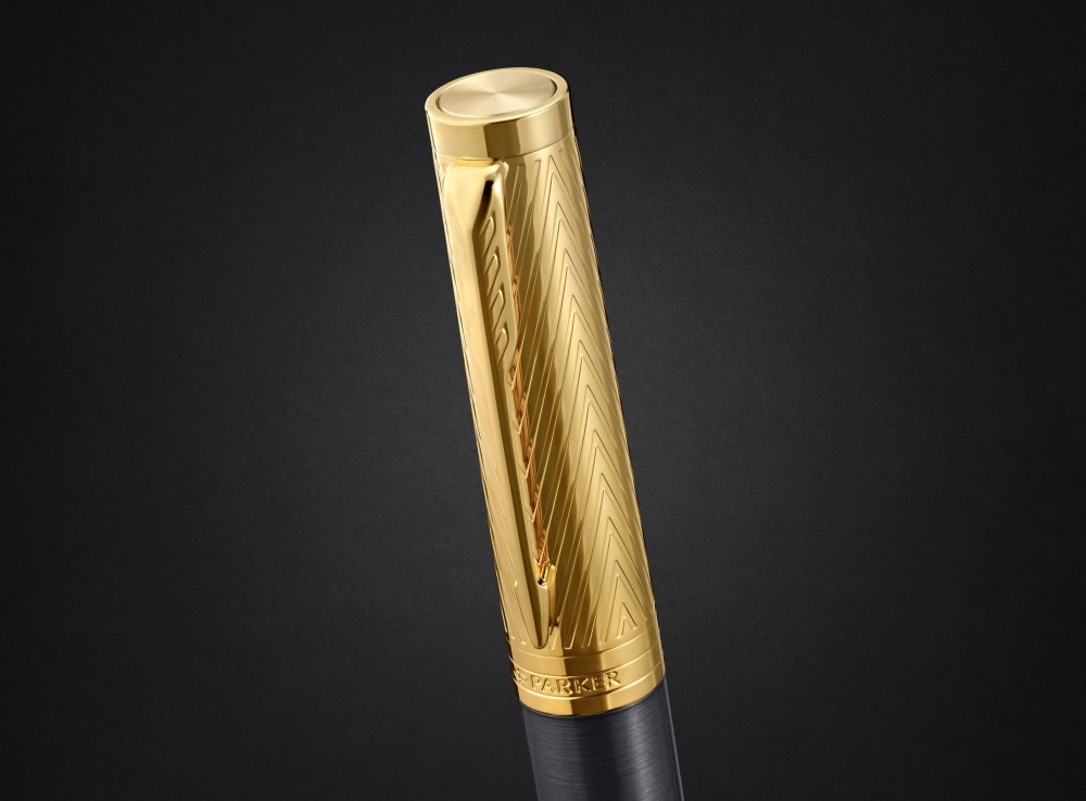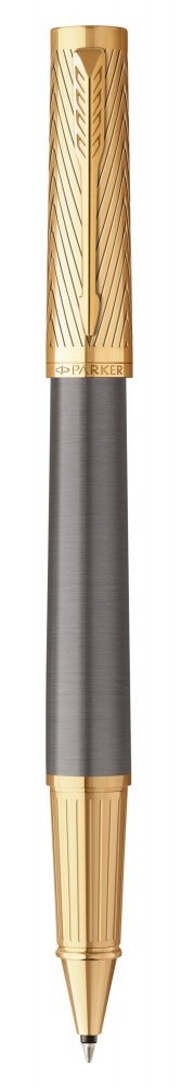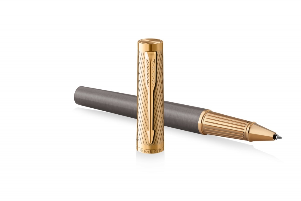 Ручка-роллер Parker из коллекции Ingenuity Arrow выполнена из латуни и покрыта серым лаком. Колпачок и зона захвата дополнены гравировкой, колпачок и декоративные элементы отделаны позолотой. Ручка упакована в специальную премиальную подарочную коробку Parker с откидной крышкой. В комплекте идет стержень-роллер черного цвета, он находится под платформой с ручкой.