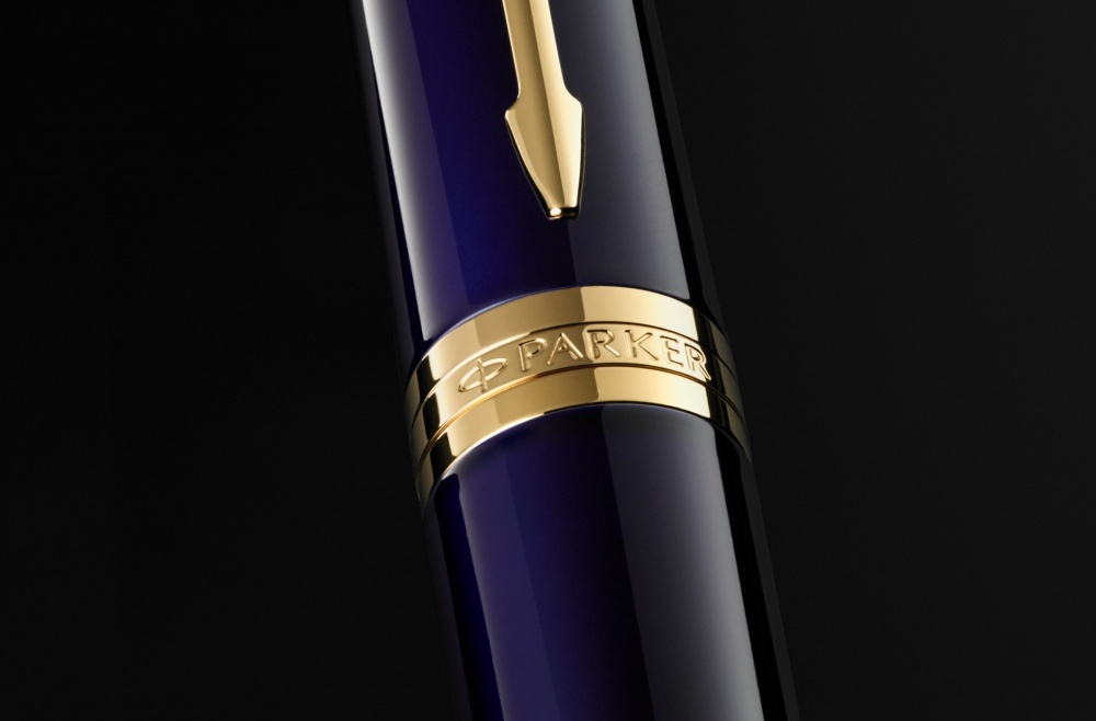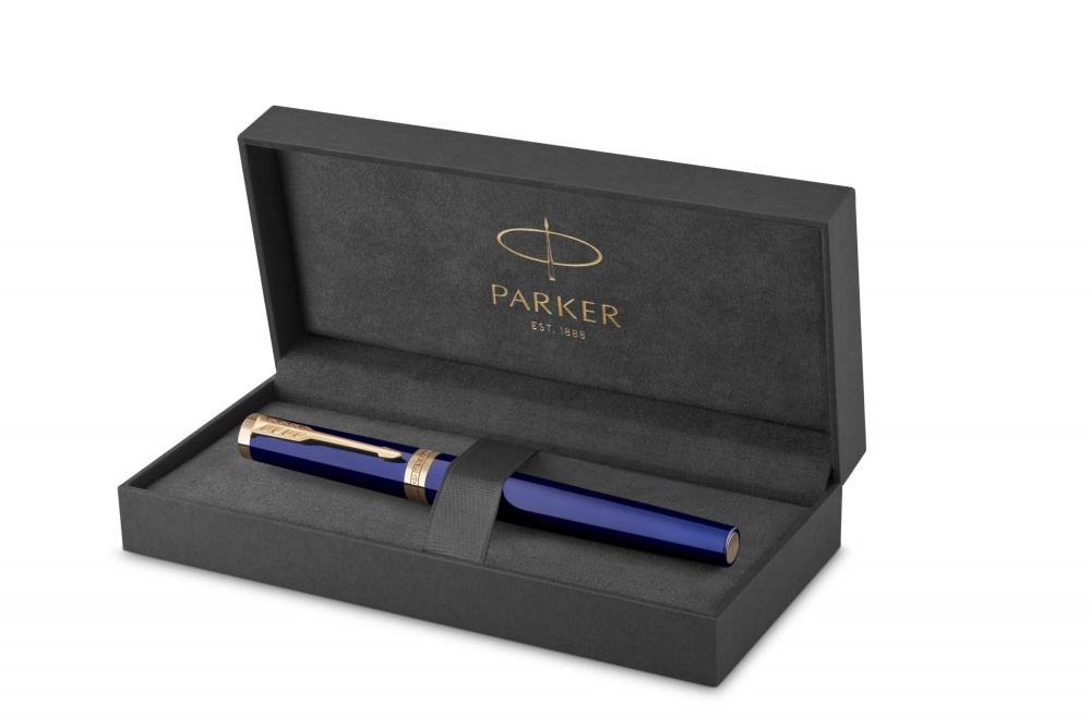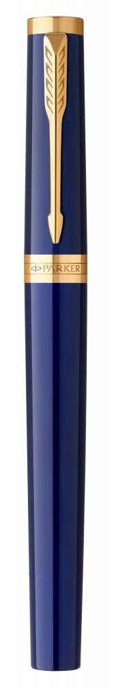 Корпус покрыт глянцевым лаком глубокого синего цвета. Зона захвата золотого цвета украшена отгравированными прямыми линиями. Дизайн дополнен позолоченными декоративными элементами. Ручка упакована в изысканную фирменную коробку Parker.