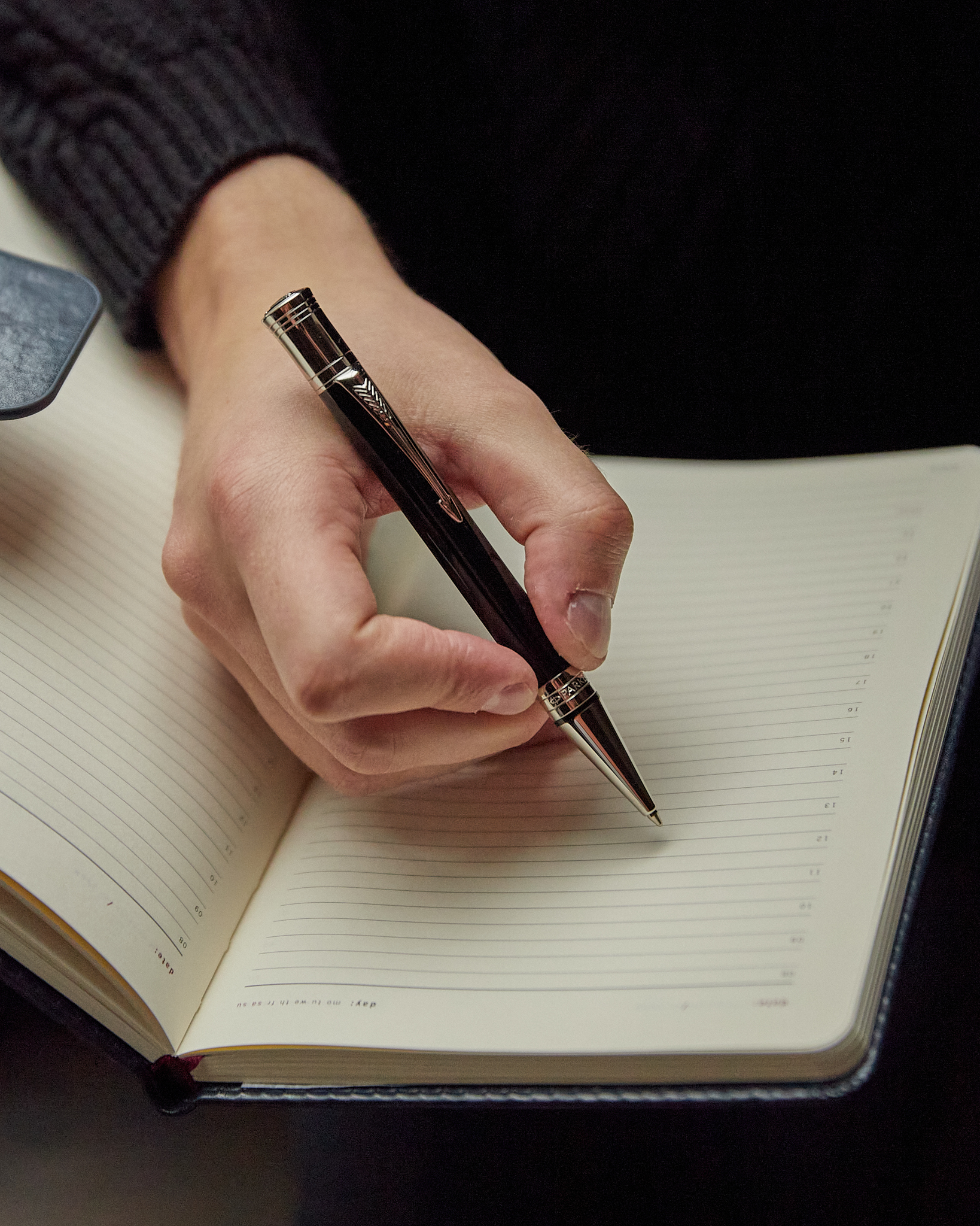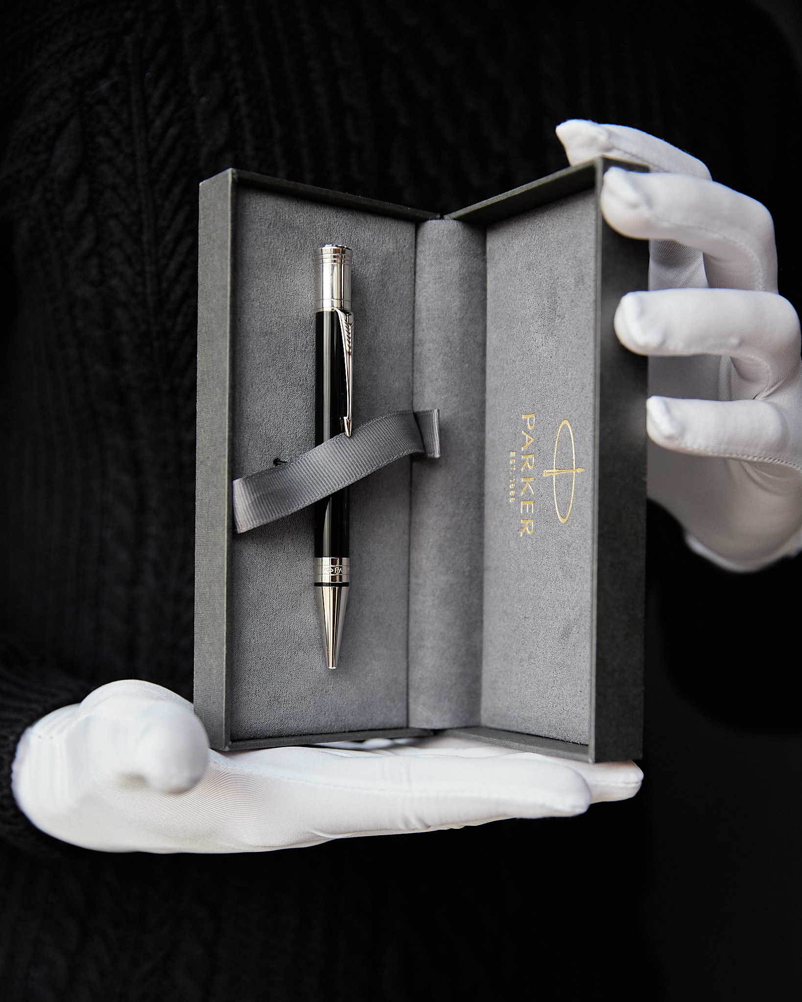 Шариковая ручка Parker Duofold K74 1931390 с поворотным механизмом. Клип выполнен в виде стрелы, сделан из бериллиевой меди покрытой никеле-полладием. Эмблема на торце ручки из латуни с гравировкой со знаком туза. На корпусе из акриловой смолы черного цвета гравировка с исторической лентой Parker. Кольцо корпуса и зона захвата из латуни с никеле-полладиевым покрытием. Фирменная упаковка Parker, на боковой стороне коробки нарисованы гербы - подтверждение гарантии Британского Королевского двора. Сделано во Франции.