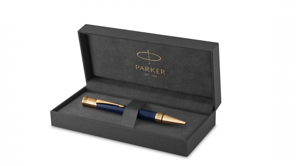 Тщательно выгравированный лазером шевронный узор с синим лаком с металлическим отливом и отделкой из золота 23 К. Ручка упакована в изысканную фирменную коробку Parker.